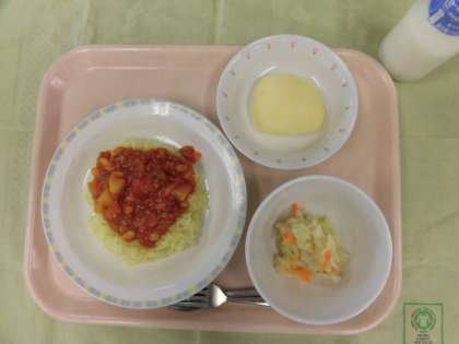 今日の給食は、チリビーンズライス、牛乳、キャベツサラダ、くだもの(りんご)でした。チリビーンズライスは、少しピリ辛く、子どもたちはご飯と一緒にモリモリ食べていました。
