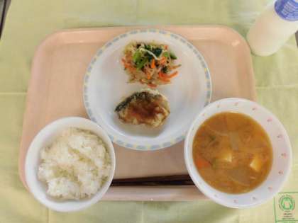 今日の給食は、ごはん、牛乳、魚の南蛮漬け、野菜のごまだれかけ、田舎汁でした。魚の南蛮漬けや野菜のごまだれかけがとてもさっぱりしていておいしかったです。田舎汁も野菜がたくさん入っていました。