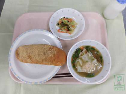 今日の給食は、きな粉揚げパン、牛乳、ワンタンスープ、糸寒天サラダでした。子どもたちが大好きな揚げパン。献立を確認した時に「やった!」と声があがりました。ワンタンスープのワンタンは全て手作りです。おいしくいただきました。