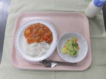 今日の給食は、ハッシュドポークライス、牛乳、フレンチサラダでした。今日のハッシュドポークやカレーのような献立は、子どもは食べやすいようで、たくさん食べていました。「おかわり」には長蛇の列になる学年も……