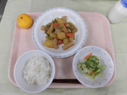 今日の給食は、ごはん、牛乳、筑前煮、野菜の甘酢かけでした。野菜をモリモリ食べることができました。和食が出るとホッとします。