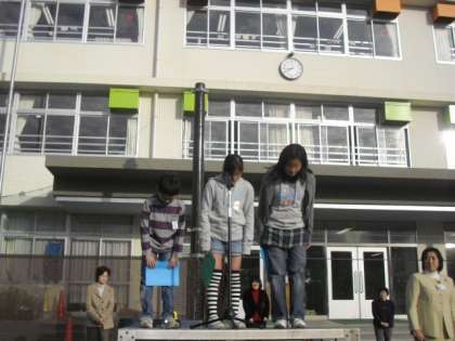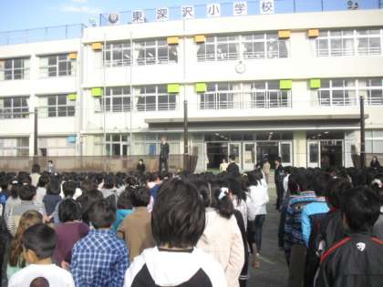 「あけましておめでとうございます」「おめでとうございます」の元気のあいさつで、東深沢小学校の平成23年もはじまりました。寒い中ですが、子どもたちは、きちんとした姿勢でお話を聞きました。3学期は5,6年生が53日、1〜4年生が52日登校します。3学期のめあてを決め、めあて達成に向け努力していくましょう。