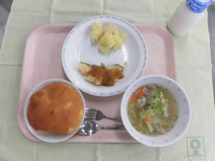 今日の給食は、パインパン、牛乳、魚のバーベキューソース、粉吹芋、マカロニスープでした。魚のバーベキューソースに使われていたホキという魚がとてもやわらかく食べやすかったです。