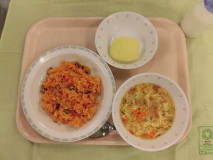 今日の給食は、チキンライス、牛乳、卵スープ、くだもの(りんご)でした。チキンライスも卵スープの子どもたちに大人気で、すぐに食缶が空になっているクラスもありました。