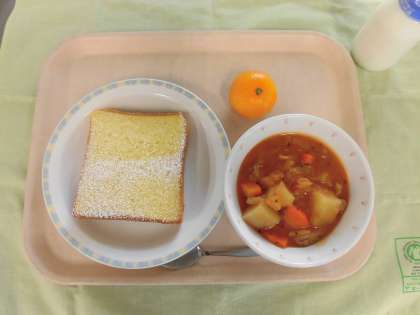 今日の給食は、フレンチトースト、牛乳、ボルシチ、くだもの(みかん)でした。フレンチトーストが学芸会のご褒美のように感じました。食パンの端もフレンチトーストにしておかわりを増やしてくれました。6年生はおかわりを含め、全て食べました。