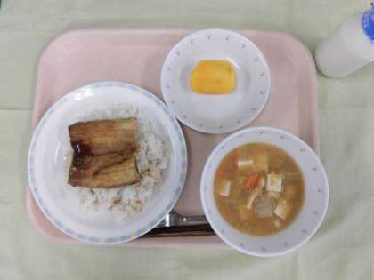 今日の給食は、さんまのかば焼き丼、牛乳、田舎汁、くだもの(柿)でした。最近気温も冬へ向かってきていますが、果物の柿がとてもみずみずしくて、まだ続く秋を感じることができました。