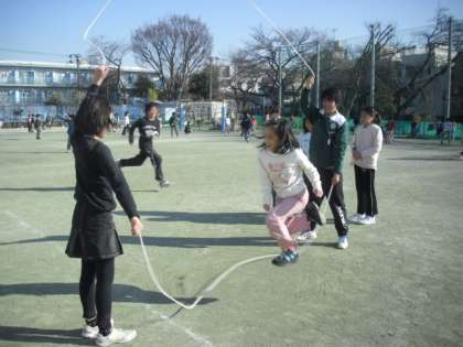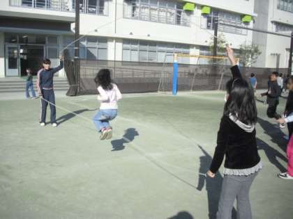 4年生では、ダブルダッジを練習しています。休み時間のプチ流行です。