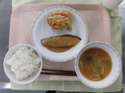 今日の給食は、ごはん、牛乳、魚のみそマヨネーズ焼き、野菜のおかかあえ、みそ汁でした。魚のみそマヨネーズ焼きの魚は、鮭の切り身でした。魚独特のにおいはなく、みそとマヨネーズが絶妙にマッチした給食でした。