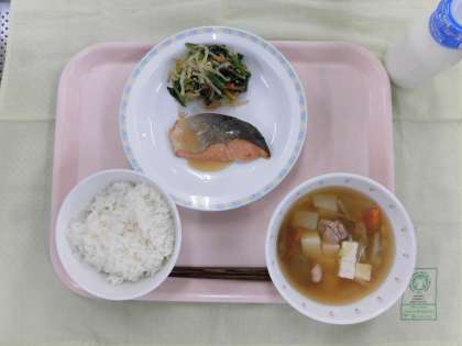 今日の給食は、ごはん、牛乳、魚の塩こうじ焼き、野菜のごまあえ、けんちん汁でした。塩こうじの塩気が、魚のうまみと合わさって、ご飯が進む給食でした。