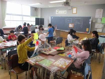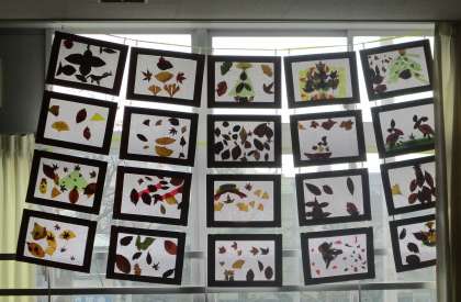 本校前の学園通りは、桜や銀杏の木々が紅や黄色に色づき、葉を落としています。主事さんは児童の登下校前に道路を掃き清めてくれています。2年生の児童は、お気に入りの落ち葉を集めて作品にし、自然の美しさを味わっています。この後、ランプシェードに仕上げます。