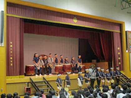 高進太鼓チーム「こざくら」が、全校朝会で和太鼓の演奏を披露しました。約20名の部員による迫力ある和太鼓の響きに校児童が聴き入っていました。日頃の練習の成果が発揮された素晴らしい演奏でした。