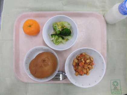 今日の給食は、黒砂糖パン、牛乳、ポークビーンズ、ブロッコリーとコーンのサラダ、くだもの(みかん)でした。お昼の放送で、ブロッコリーについてのお話がありました。日本に伝えられた時代や、なぜ伝えられたのかを知ることで、より給食に興味を持って食べている児童がみられました。