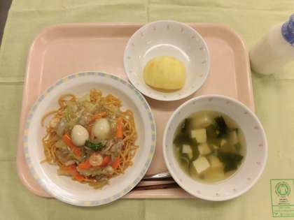今日の給食は、あんかけ焼きそば、牛乳、わかめスープ、くだもの(りんご)でした。
