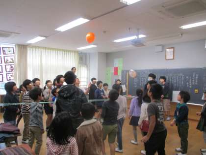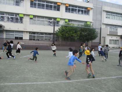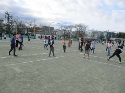 始業前の30分間、異学年の縦割り班ごとに一緒に遊びました。高学年は低学年が楽しめるように様々に配慮していて頼もしいです。大規模校ですが、皆が安全に楽しめるように、施設を有効に使い、場やルールを工夫していて感心します。