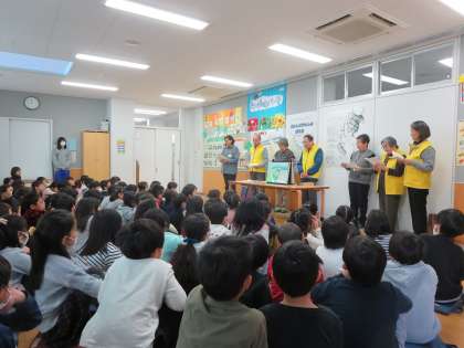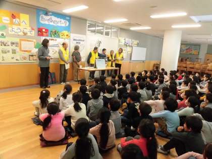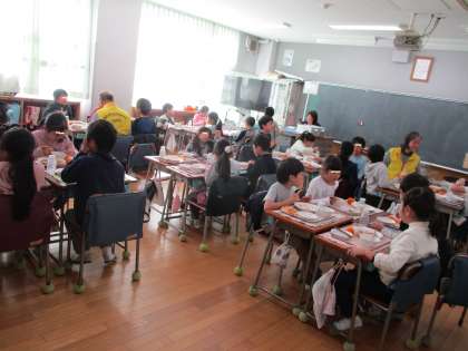 地域の高齢者の方をゲストティーチャーにお招きして、昔の地域の様子をお話していただきました。呑川の謂れなどを紙芝居で分かりやすく教えていただきました。そのあとは一緒に楽しく給食をいただきました。子どもたちはとても嬉しそうでした。