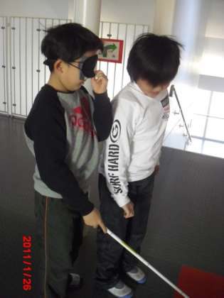 アイマスクをして、白杖をもっている子どもたちと案内している子どもたちとの会話です。
