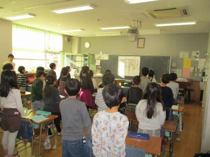体育館で予定していた音楽朝会を放送でおこないました。校内でもインフルエンザに罹患する児童が増えてきたため、蔓延を予防するため、放送室から音楽を流し、各教室で歌う形で実施しました。初めての試みでしたが、互いの教室から聞こえてくる歌声に耳を傾けながら、クラスごとに歌いました。元気な歌声が校舎内に美しく響いていました。
