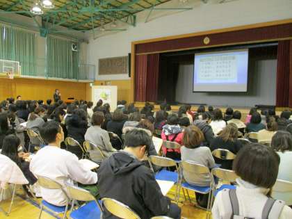 来春、本校に入学を予定されている新1年生の保護者の皆様にご来校いただき、入学説明会を実施しました。校長より本校の教育活動の重点や様子を紹介させていただき、現1年生の担任より、入学にあたって準備していただきたい心がまえや学用品を説明させていただきました。桜が咲く頃、かわいい1年生が入学してくるのを心待ちにしております。