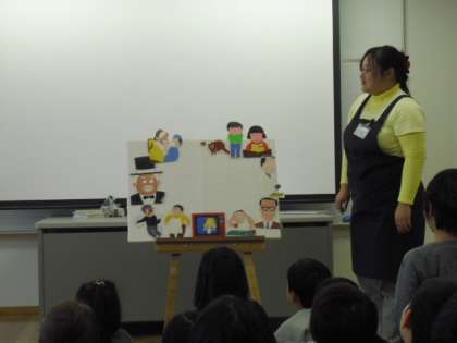 深沢図書館の皆さんにいらしていただき、「おはなし会」が行われました。プログラムは、素話「かにかにこそこそ」、紙芝居「おとうさん」、人形「のはらうた より こぶたはなこさん」、パネルシアター「これは のみの ぴこ」です。どのお話も趣向が凝らされていて、子ども達も笑い声や歓声をあげながら、お話の世界に夢中になっていました。最後には面白い本も紹介していただきました。これから図書館通いする子も多くなると思います。深沢図書館の皆さん、どうもありがとうございました。  (2年担任 川村)