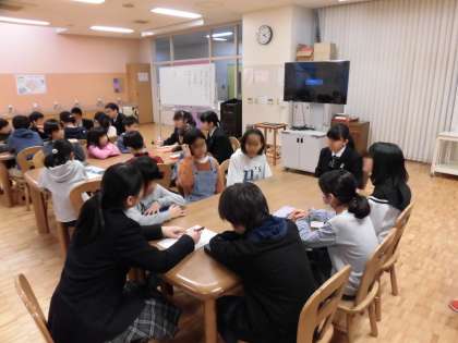 計画委員が東深沢中学校に行き、東深沢中学校生徒会のみなさんと等々力小児童会のみなさんと各学校の成果や課題について意見交換を行いました。
