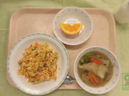 今日の給食は、キムチチャーハン、牛乳、ワンタンスープ、くだもの(いよかん)でした。