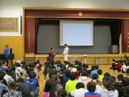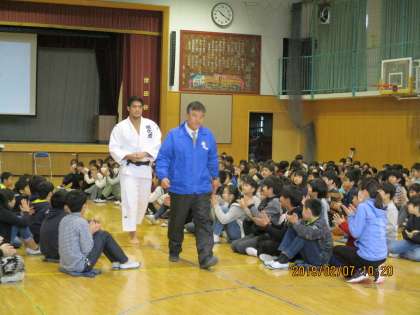 リオオリンピック柔道100キロ級銅メダリストの羽賀龍之介選手をお招きし、ご講演をいただきました。オリンピックでの様々な国の選手との交流やご自身の体験談などを、とても分かりやすく楽しくお話してくださいました。子どもたちは羽賀選手に憧れと親しみを感じ、オリンピックを身近に感じることができました。