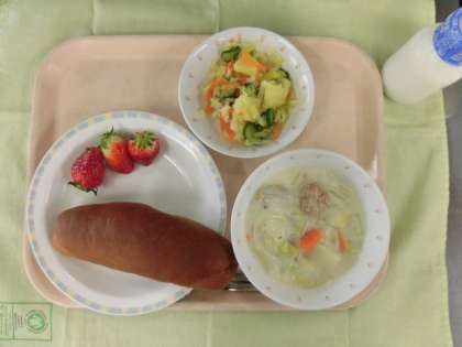 今日の給食は、ココアパン、牛乳、白菜と肉だんごのクリームに、フレンチサラダ、くだもの(いちご)でした。