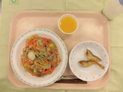 今日の給食は、あんかけ焼きそば、牛乳、小魚のからあげ、オレンジゼリーでした。あんかけ焼きそばには、エビや玉子の他、色とりどりの野菜が入っていて、まだまだ続く寒い冬を乗り切ろうとする子どもたちのパワーになる給食でした。