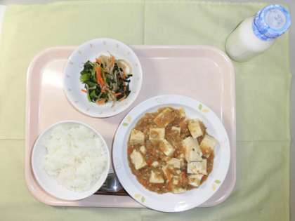 今日の給食は、ごはん、牛乳、四川豆腐、いためナムル、くだもの(ポンカン)でした。