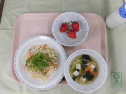 今日の給食は、ちらしずし、牛乳、よしのじる、くだもの(いちご)でした。