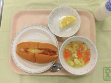 今日の給食は、ミートサンド、牛乳、イタリアンスープ、くだもの(はるか)でした。
