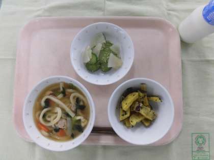 今日の給食は、五目うどん、牛乳、きゅうりと大根のごま風味、大学いもでした。さつまいもは、夏に収穫されることの多い芋です。収穫してから少し置いておくと、甘みが増すそうです。子どもたちも口いっぱいに頬張って、おいしそうに食べていました。