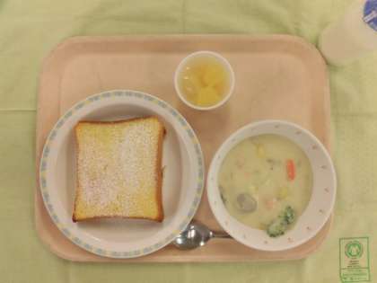 今日の給食は、フレンチトースト、牛乳、さつまいもシチュー、フルーツゼリーでした。