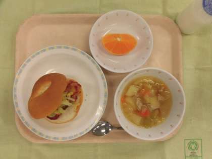 今日の給食は、フィッシュサンド、牛乳、ひよこまめのスープ、くだもの(天草オレンジ)でした。