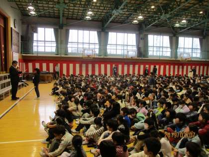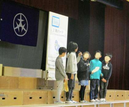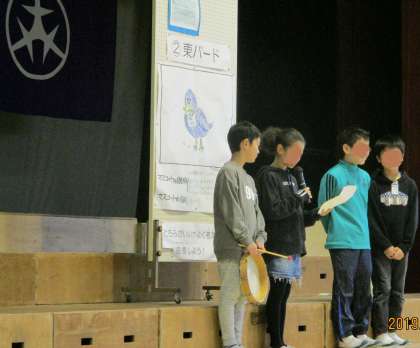 今年度、最後の全校朝会では、文集「せたがやの子」や読書感想文集「ともしび」に掲載された児童等、様々な分野で活躍した児童の表彰を実施しました。その後、全校児童に募集した「70周年記念マスコット」の発表がありました。最終選考「ヒガコーン」と「東バード」の全校投票の結果が発表され、僅差に歓声があがり、「東バード」に決定しました。