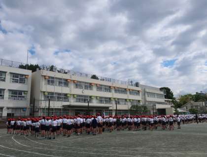赤白に分かれて、運動会の開会式の隊形に整列しました。
