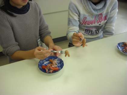 2時間目は、5年生の家庭科です。タコウインナーを作りました。おいしく食べた後は、包装紙から材料や添加物の学習をしました。