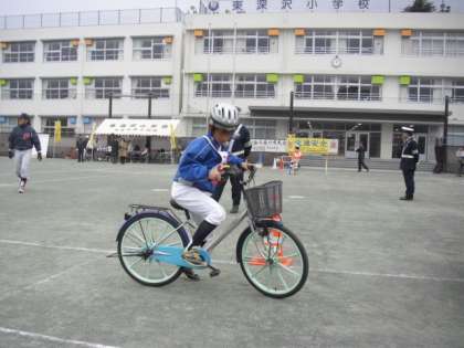 玉川交通安全協会による「第11回自転車の安全な乗り方大会」が東深沢小学校の校庭で行われました。ヘルメットをかぶって、安全な乗り方に挑戦です。