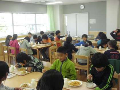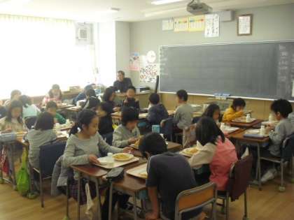 3年生の教室でも5年生のランチルームでもお行儀よく給食を食べていました。