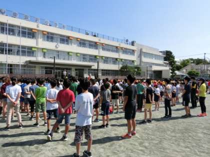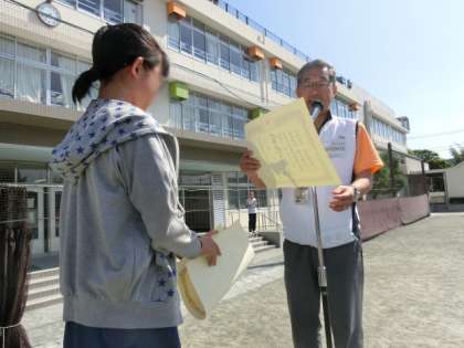 今朝は全校朝会でした。校長から命の大切さや安全に気を付けることについて話がありました。その後、空手で活躍した6年生の表彰がありました。