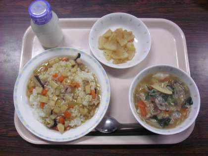 献立は、あんかけチャーハン、ワンタンスープ、華風だいこん、牛乳です。
