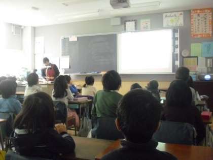 お友達の作品をプロジェクターで映して、良いところを発表します。