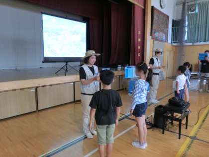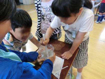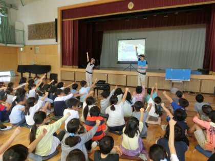 4年生は、社会科「住みよいくらし」の学習として、東京都水道局の方に来ていただき、「水道キャラバン」を行いました。自分たちが普段飲んでいる水がどこから来て、どのようにきれいになっているのかを、映像や実際の実験を用いて学習しました。