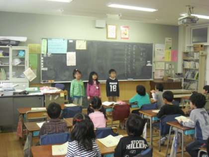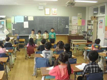 学んだ一つ一つの俳句や短歌などをもう一度おさらいして、班の友達と声をあわせて発表しました。1組の子どもたちも、聴くお友達が上手なので、発表する子どもたちもとても気持ちよく発表できました。1年生とても上手です。