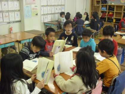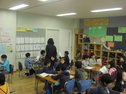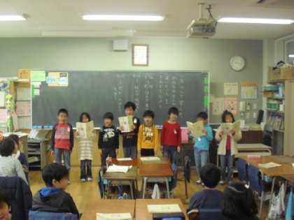 1時間目は、2組の教科「日本語」です。1年間学んだ俳句や詩などの中から、気に入ったものを班のお友達と練習して、発表しました。発表する子どもたちをより上手にしたのは、聴くお友達の態度です。発表のお友達と一緒に小さな声で口ずさんだり、足でリズムを刻んだりととても楽しそうでした。みんな、日本語が大好きです。
