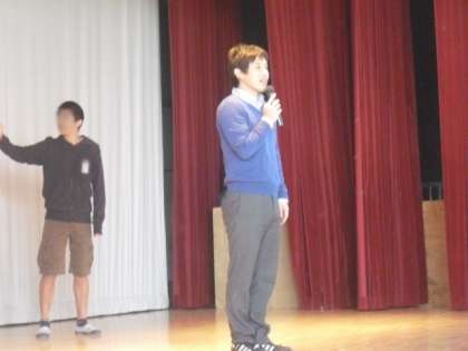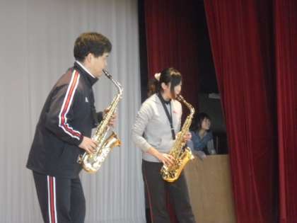 今朝の木曜広場では、先生の特技を当てるクイズをしました。答えは、先生方が実際に特技を披露をします。寺山先生・百瀬先生の特技は「ソフトボール」です。グラブでボールをキャッチすると「バシッ」という音が響きました。角田先生は、何と円周率を50ケタまで暗記しています。川村先生・池田先生はアルトサックスです。「聖者の行進」の演奏に体育館に手拍子が広がりました。