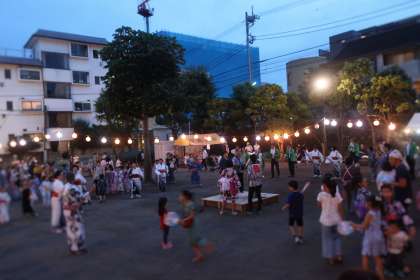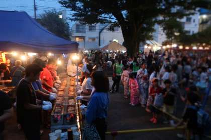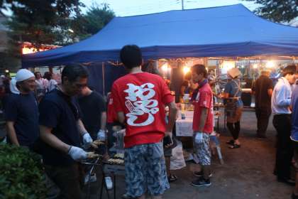 町会の焼き鳥屋さんでは、おやじの会の方に交ざって、本校の教員も手伝っています。