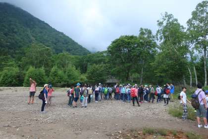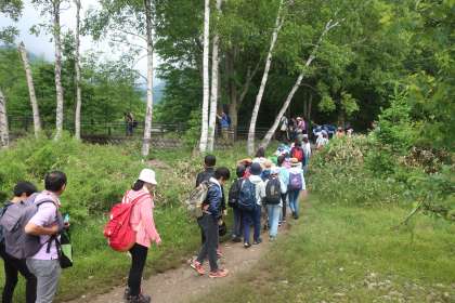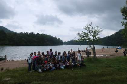 湯ノ湖畔でクラス写真を撮って、ハイキングに出発です。