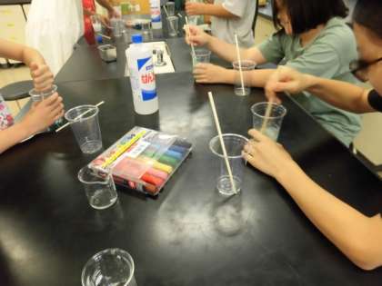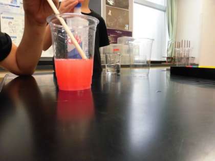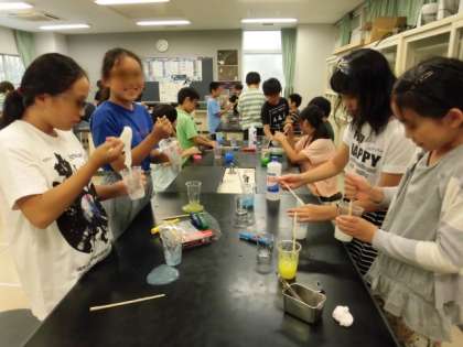 5、6年生を対象にスライム教室を行いました。せんたくのりと水、魔法の水をまぜ合わせ、好きな色を付けてスライムを作りました。また、今回は忍者絵の具を使いました。紫外線に当たると色が変わる絵の具です。校庭に出て、色が突然変わるスライムにみんな驚いていました。みんなとてもよくできていました。