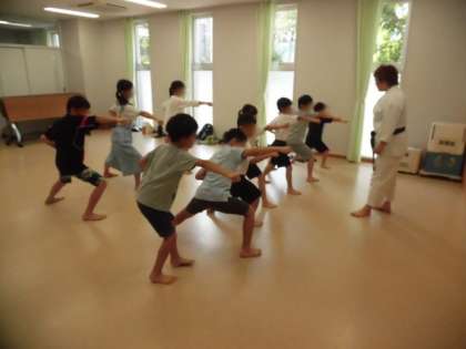 次に「突き」の練習です。『中段突き』を習い、気合を入れて「せい!」や「えい!」と、声を出して力強く突きをしました。